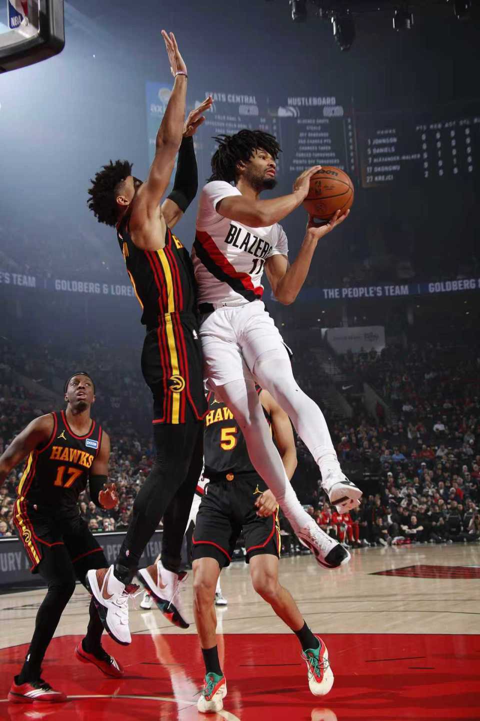 次节比赛,开拓者进攻火力下滑比首节少得到12分,老鹰则是首次单节得分30+。开拓者内外开花扩大38-27领先,老鹰连追6分,霍勒迪两罚一中与罗威空接暴扣,老鹰连追4分。开拓者扩大7分优势,并在之后维持48-41领先优势,老鹰一波15-6攻势反超比分。开拓者单节21-31输掉10分,上半场结束开拓者54-56被老鹰反超。前两节比赛,开拓者三分仅23中6,夏普9中6得到18+6,杨瀚森未登场;老鹰三分19中7,奥孔古13分与麦科勒姆11分。